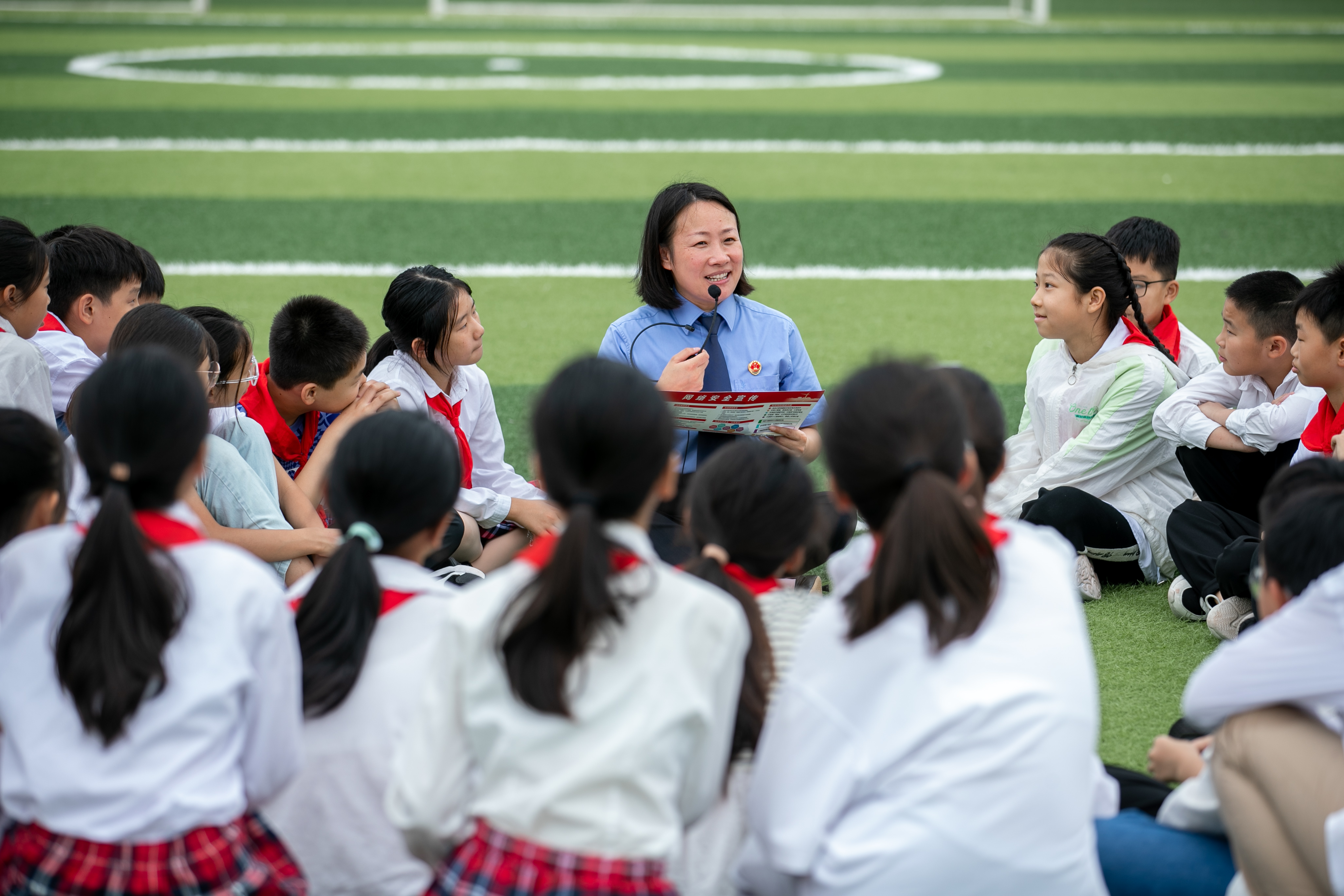 江苏省兴化市检察院未成年人法治宣讲团的工作人员走进兴化市文峰小学,通过讲故事的方式给学生讲解网络安全知识。新华社照片(2023年9月14日)周社根 摄